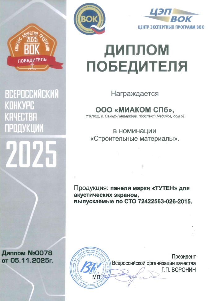 Компания «МИАКОМ СПб» была награждена дипломом победителя в номинации «Строительные материалы» на Всероссийском конкурсе качества продукции-2025!